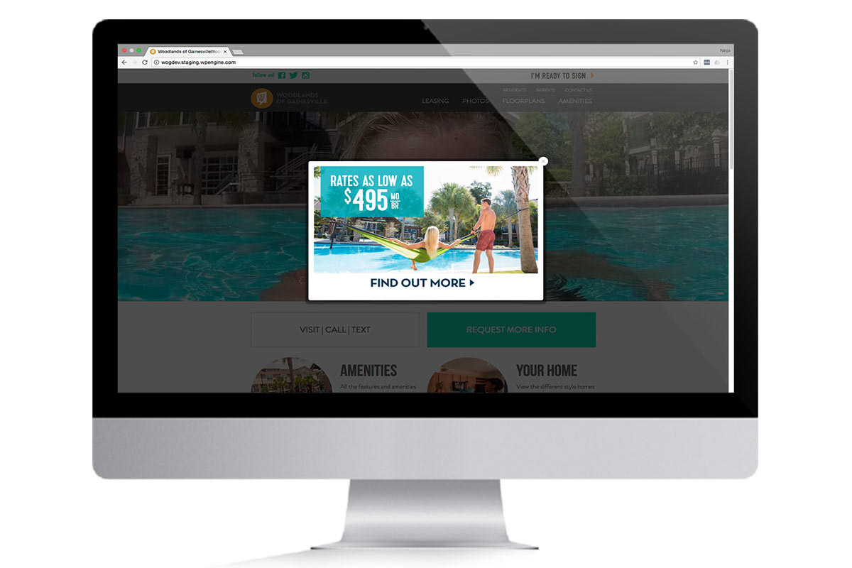 All the marketing pieces show the current special or marketing push, property's logo, contact information and a lifestyle photo. For the larger print pieces, the current rate (if published), expended contact information, and a few of the most popular amenities are also included.