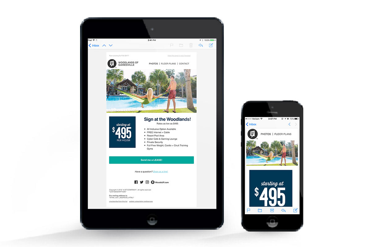 Now Leasing items were made for a Fall marketing push at a student housing community. They emphasize the rates and prime prospective tenants to think about housing for next Fall.
